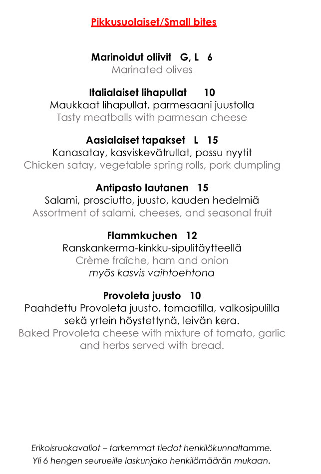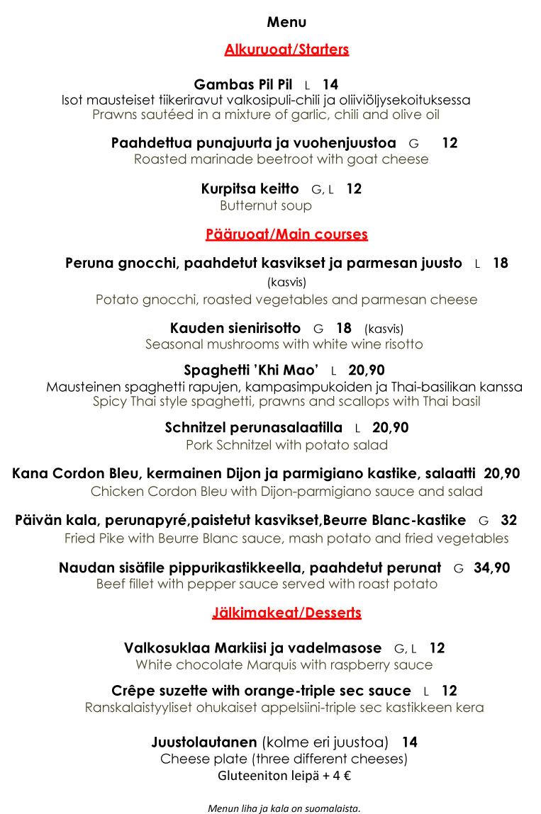 Menumme tarjoaa pikkusuolaisia viinien kanssa nautittaviksi ja à la carte -listamme illallistamiseen alku- pää ja jälkiruokia vapaasti valittaviksi.