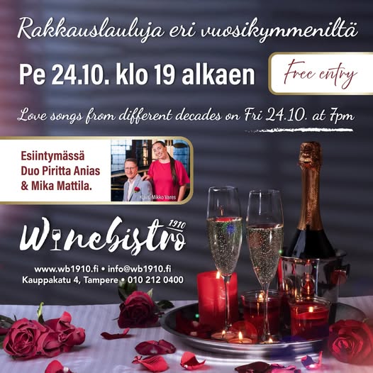 Ota rakastasi kädestä kiinni ja katso syvälle silmiin Winebistro 1910:n ”Romanttisessa illassa”. Kynttiläillallinen, tunnelmallinen musiikki ja hyvä ruoka viineineen – ikimuistoinen ilta kaikille pariskunnille. Tervetuloa!