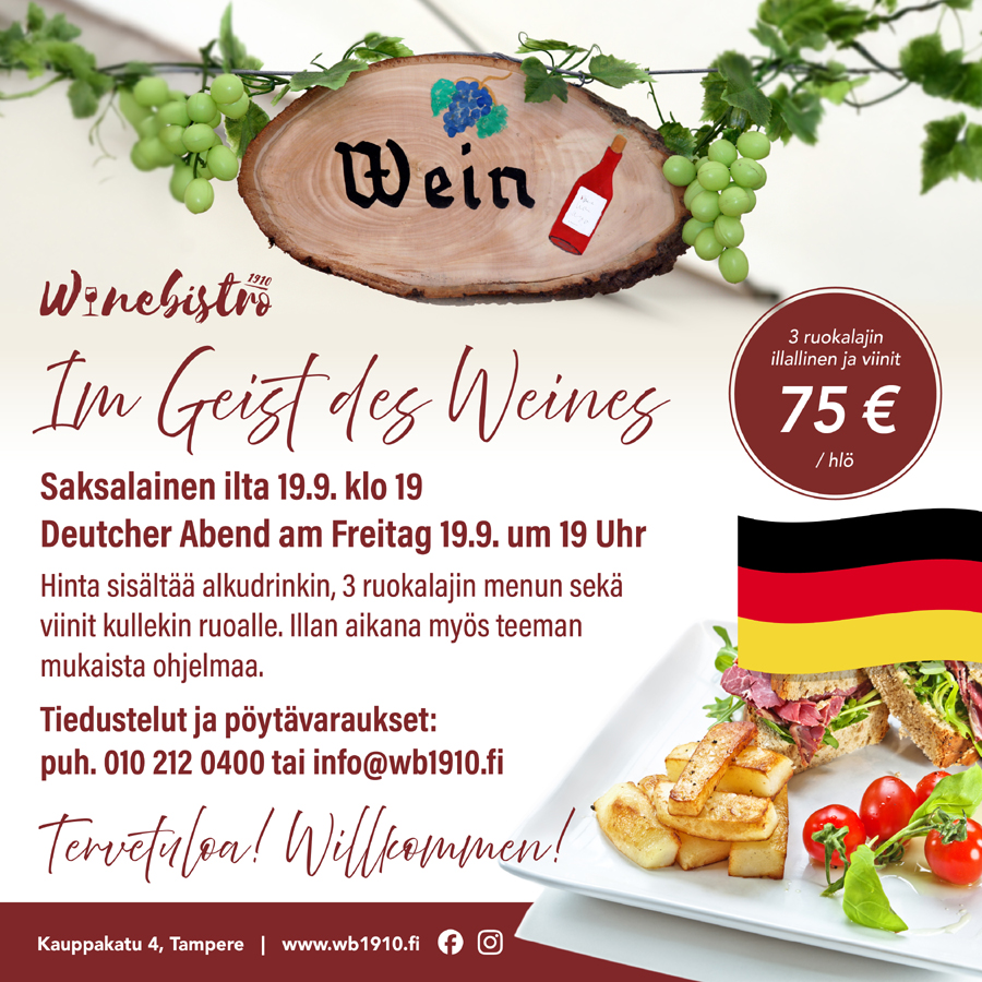 Winebistrossa järjestetään perjantaina 19.9. saksalainen viini-ilta, jonka kolmen ruokalajin menuun sisältyy alkudrinkki sekä viinit jokaiselle ruokalajille. Viini-illallisen aikana on tiedossa myös teeman mukaista ohjelmaa.